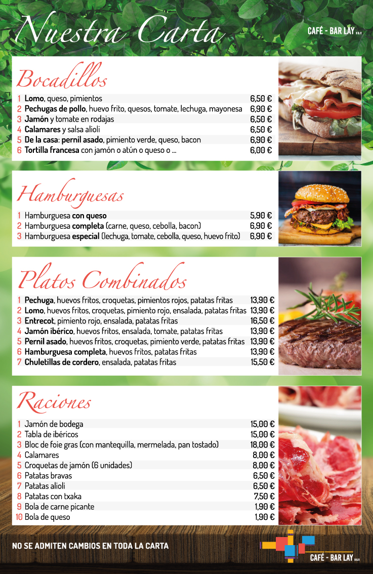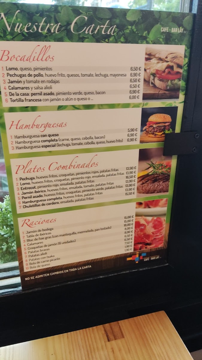 Welcome to Lay Kafe-taberna, a charming cafeteria located in the heart of Errenteria, Spain. Nestled on San Marko Kalea, this cozy spot is a haven for food enthusiasts and families alike. The menu features an enticing array of burgers, ranging from the classic cheeseburger to the hearty Completa and Especial options, all reasonably priced. Perfect for sharing, the raciones showcase traditional Spanish delights like jamón, ibéricos, and crispy calamares, making it an ideal choice for gatherings.